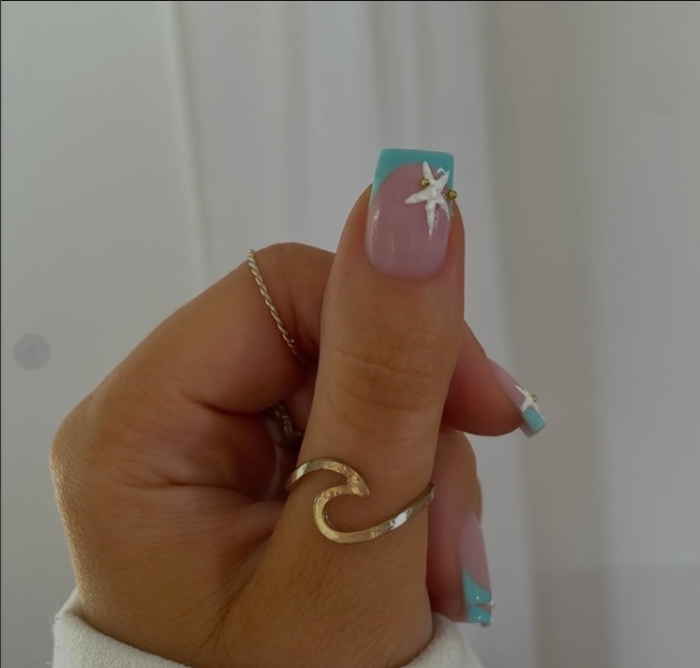 Un classico rivisitato in chiave vacanziera: punta tiffany e piccoli decori marini. Semplicemente magico.