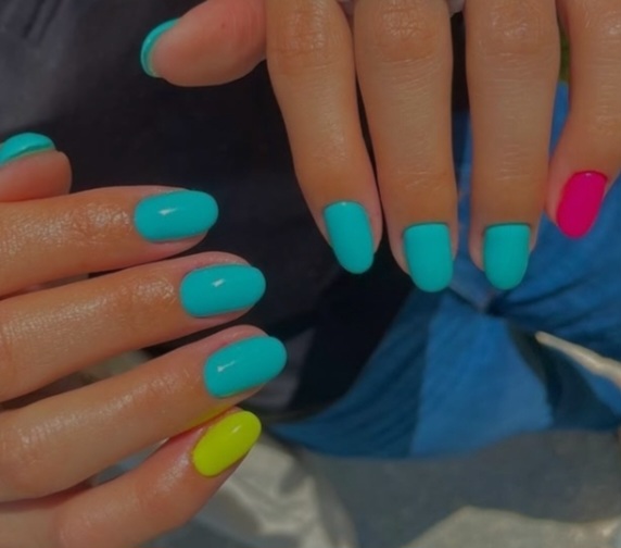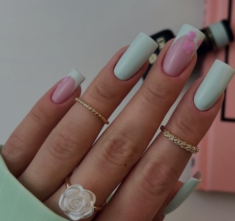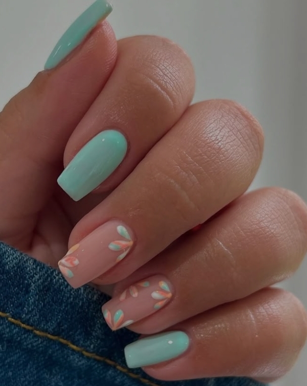 Pastello su pastello: il tiffany si fonde con il rosa tenue per una manicure delicata, ma mai banale.