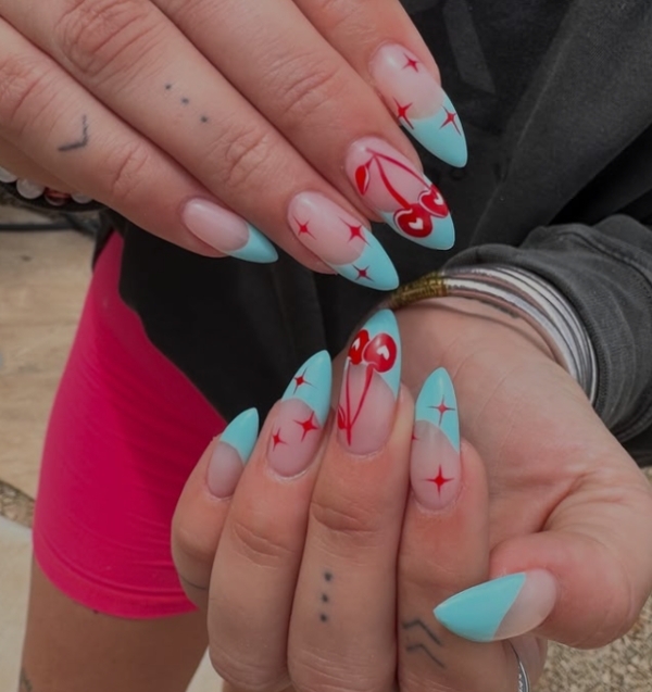 Deliziosa e giocosa, questa nail art mixa il tiffany al rosso delle ciliegie. Frizzante come un’estate italiana!