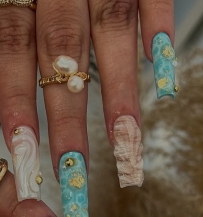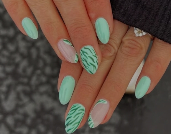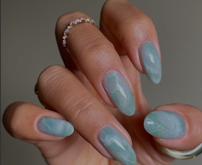 Unghie ispirate al mare, con conchiglie, onde e tonalità verde acqua. Un vero tuffo nello stile.
