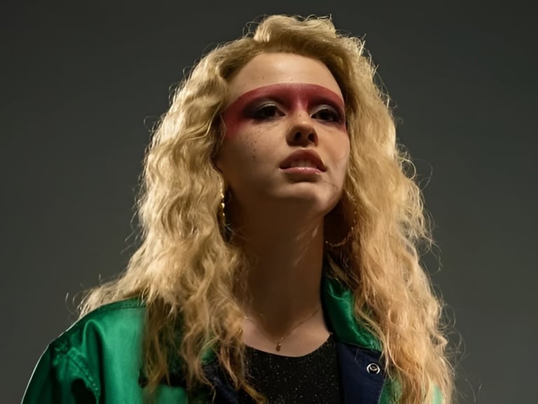 Il make-up: smokey metallico, eyeliner bold, lentiggini disegnate e la celebre maschera rossa anni ’80 che attraversa il viso. Capelli biondi cotonati: ready to slay.