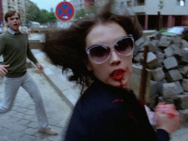 Il make-up: pelle diafana, labbra rosa sporche di sangue finto, occhi velati da occhiali da sole. Capelli spettinati e un’aura drammatica da film d’autore.