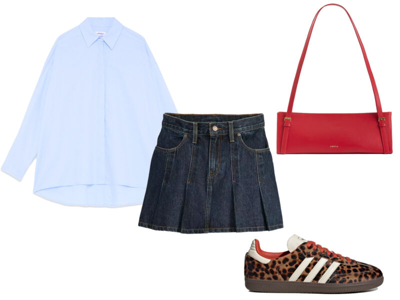Un grande ritorno dalle vibes anni 2000: la minigonna di jeans è la nuova alleata dei look casual-chic. Provala con una camicia azzurra in cotone, sneakers animalier e una borsa rossa a contrasto per dare carattere all’insieme. Perfetta per affrontare la quotidianità con leggerezza (e tanto stile).