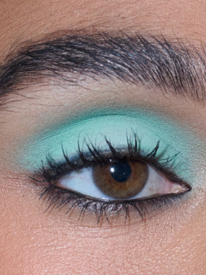 Stendi una sola tonalità pastello e sfumala leggermente verso l’alto. Completa con mascara nero e pelle luminosa.
